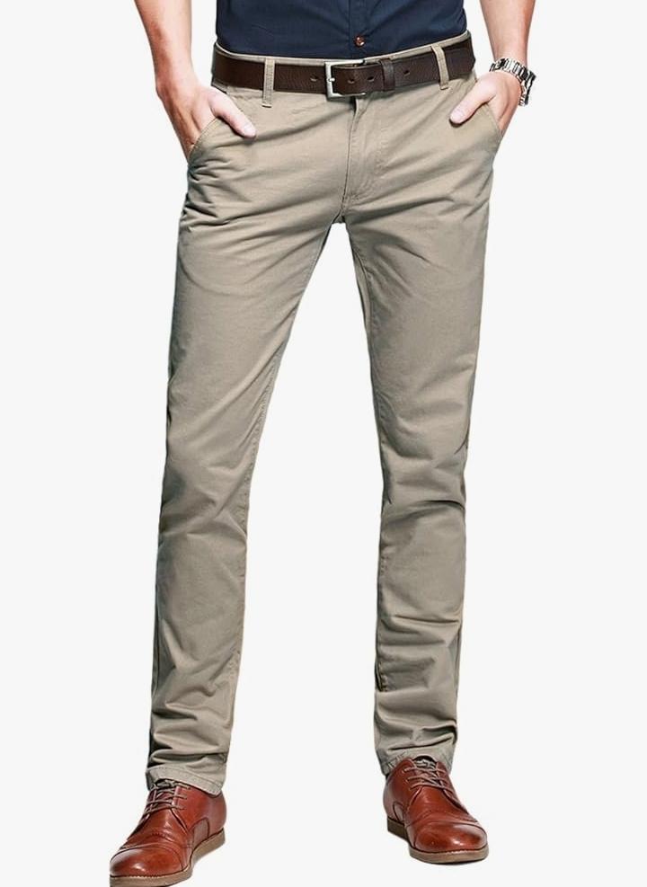 Our Light Beige Soft Khaki Men's Trousers Features zipper fly and button closure, front slant pockets, fifth-coin pocket at waistband, and classic back welt pocke.Fitted through hip and thigh, with tapered leg. Sits below the waist Straight leg: Straight through the seat and thigh with straight leg opening Classic style: Soft, high quality fabric, very comfortable to wear