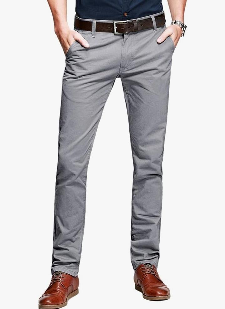 Our Light Grey Soft Khaki Men's Trousers Features zipper fly and button closure, front slant pockets, fifth-coin pocket at waistband, and classic back welt pockets Fitted through hip and thigh, with tapered leg. Sits below the waist Straight leg: Straight through the seat and thigh with straight leg opening Classic style: Soft, high quality fabric, very comfortable to wear